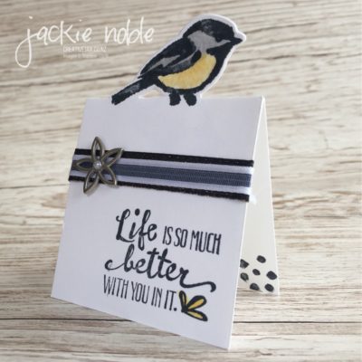 The stamped images on this little gift card are from the Petal Palette Stamp Set and I’ve used the coordinating Petals & More Thinlits Dies – you can find them on page 23 of the Occasions Catalogue. I’ve coloured the bird to resemble the New Zealand bush robin’s colours – using an Aqua Painter and So Saffron and Smokey Slate.