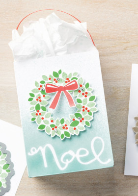 I used the 2-way glue pen as a temporary adhesive on the “Joy” – cut using the Wonderful Wreath Framelits. The cutout word formed a mask which I sponged over in Real Red – putting more colour at the bottom of the card and graduating to none at the top of the card. I could easily remove the word cutout after I’d done the sponging as it was only held temporarily. You can do that with the 2-way glue pen by letting the glue dry until it becomes tacky before sticking the item down. Of course if you put the glue on and stick it while the glue is wet – then it will be permanent.