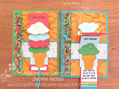 The card on the left is with the “waterfall” closed while the card on the right is after the “waterfall” has been pulled down to releal some hidden messages. This was the first waterfall card I have made. When I saw the ice cream I had visions of all those scoops stacked up and then disappearing!