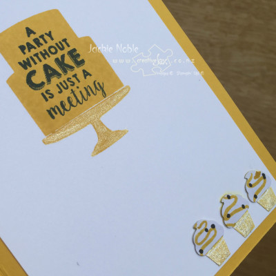 The cake was made using a couple of the other patterns – the little black dots reminded me of the passionfruit seeds! I did stamp the “hello” and cake stand with Versamark ink and heat emboss with white embossing powder to cover the seeds! I also outlined the sentiment with my Crushed Curry Stampin’ Write Marker to make it stand out.