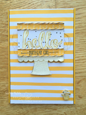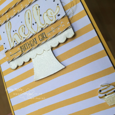 This was a fun card to put together – I’m loving the Hello stamp set! It’s a Sale-A-Bration set that is only available until the 15th February so if you don’t want to miss out – place a qualifying order with me before then to receive it for FREE. The striped paper from the It’s My Party DSP stack was ideal as a representation of the layers in Beth’s cake and also for the challenge – perfect!