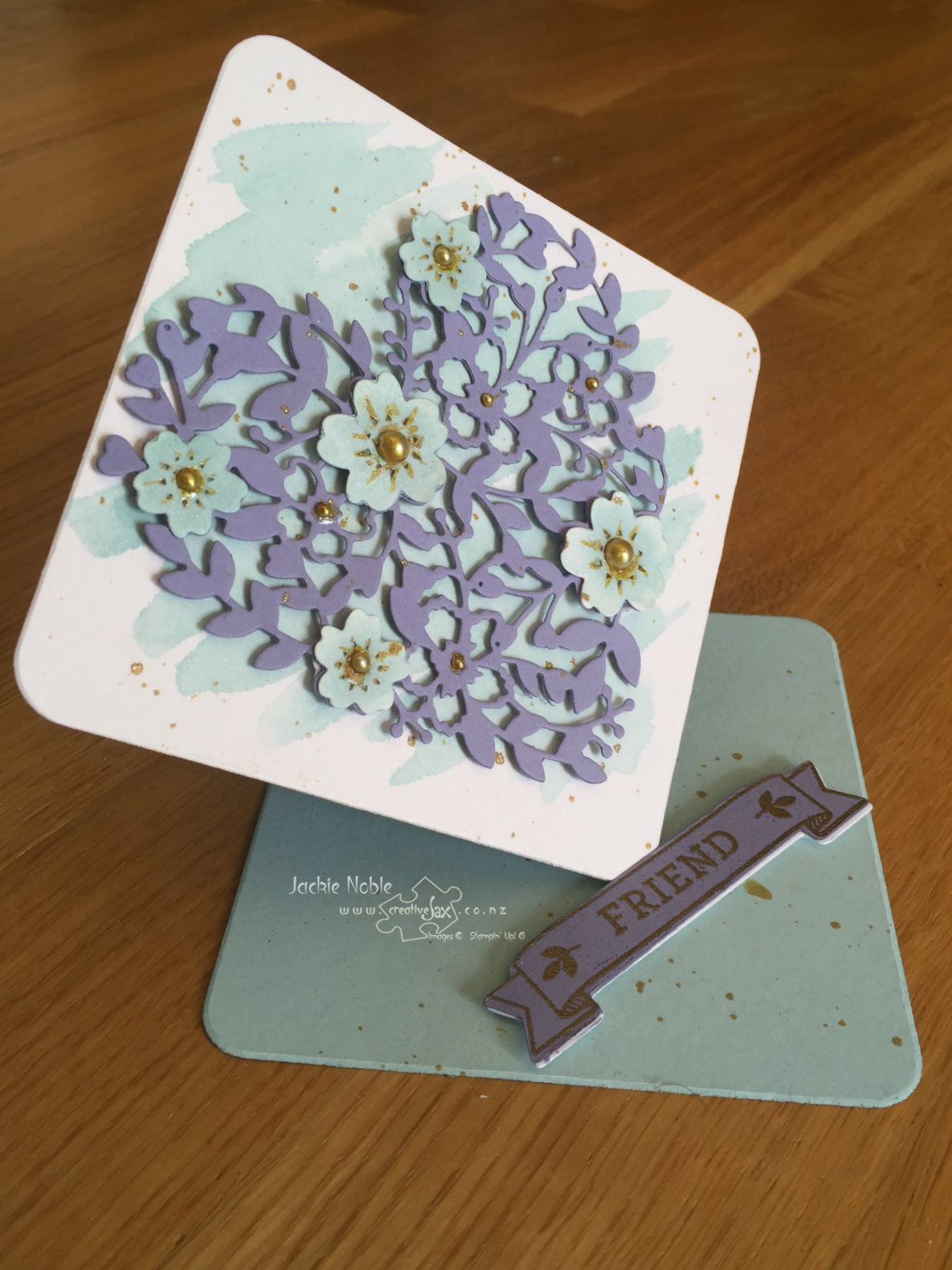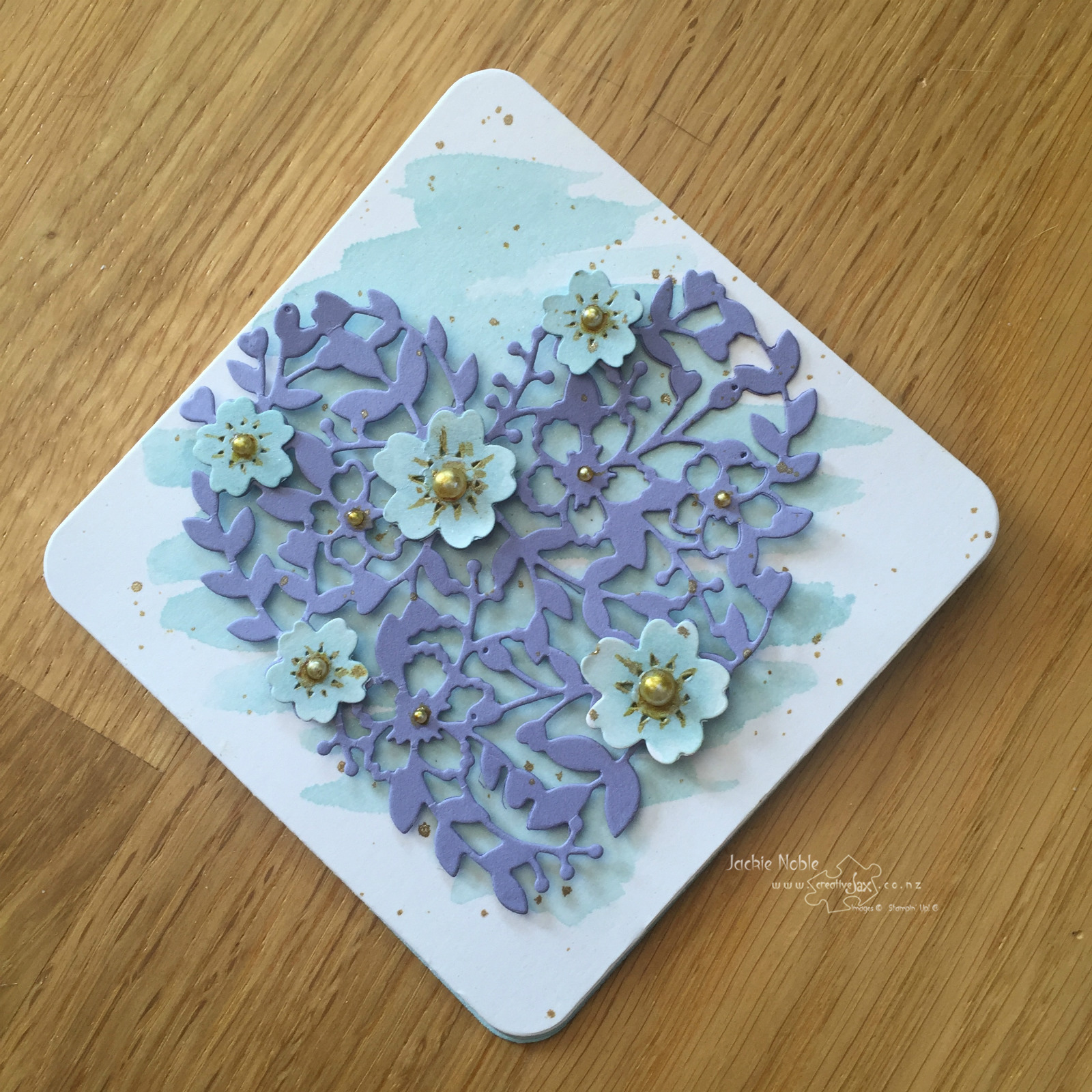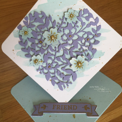 The Heart is cut from Wisteria Wonder using the Bloomin’ Heart Thinlit and adhered to the Shimmery White diamond with dimensionals – AFTER the watercolouring is completely dried!