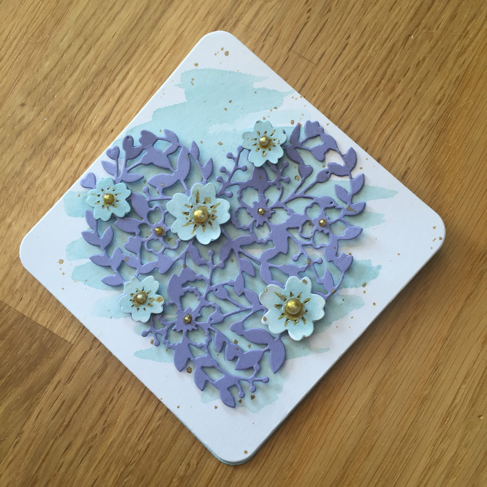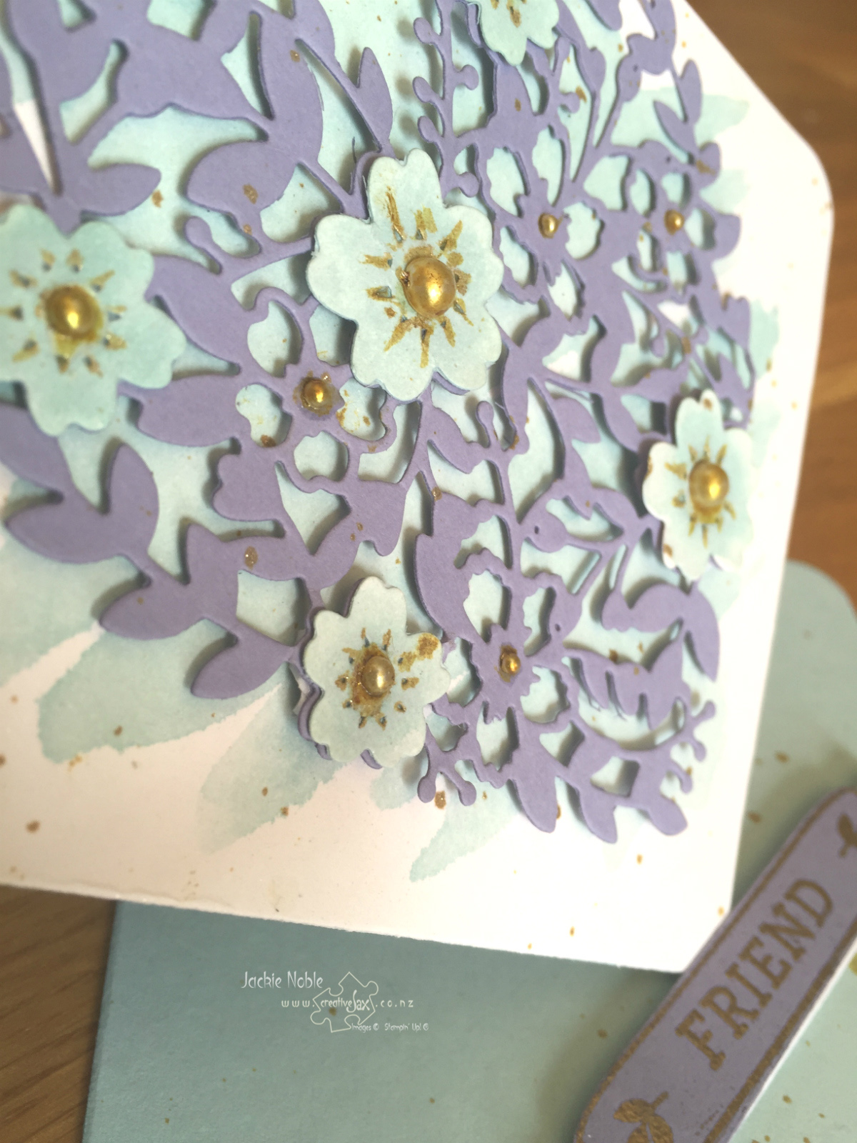 The flowers were also cut from shimmery White using the other dies from the Blooming Heart Thinlit set and watercoloured in Soft Sky before positioning onto the heart with Glue dots. The attached Basic Pearls got some Wink of Stella Treatment! I coloured them and added a few details around each pearl with the Gold Glitter Brush