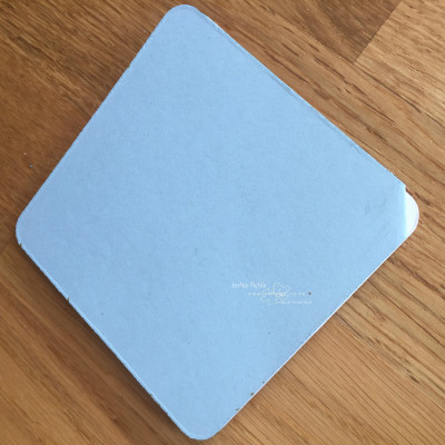I cut a 4 x 4″ piece of Shimmery White Cardstock using the same thinlit. Using an Aqua Painter and Soft Sky Ink Refill I watercoloured onto this square. I positioned the square on the diagonal so that the horizontal watercolour lines were on a diamond shape – rather than a square. This diamond was then attached to the card base.