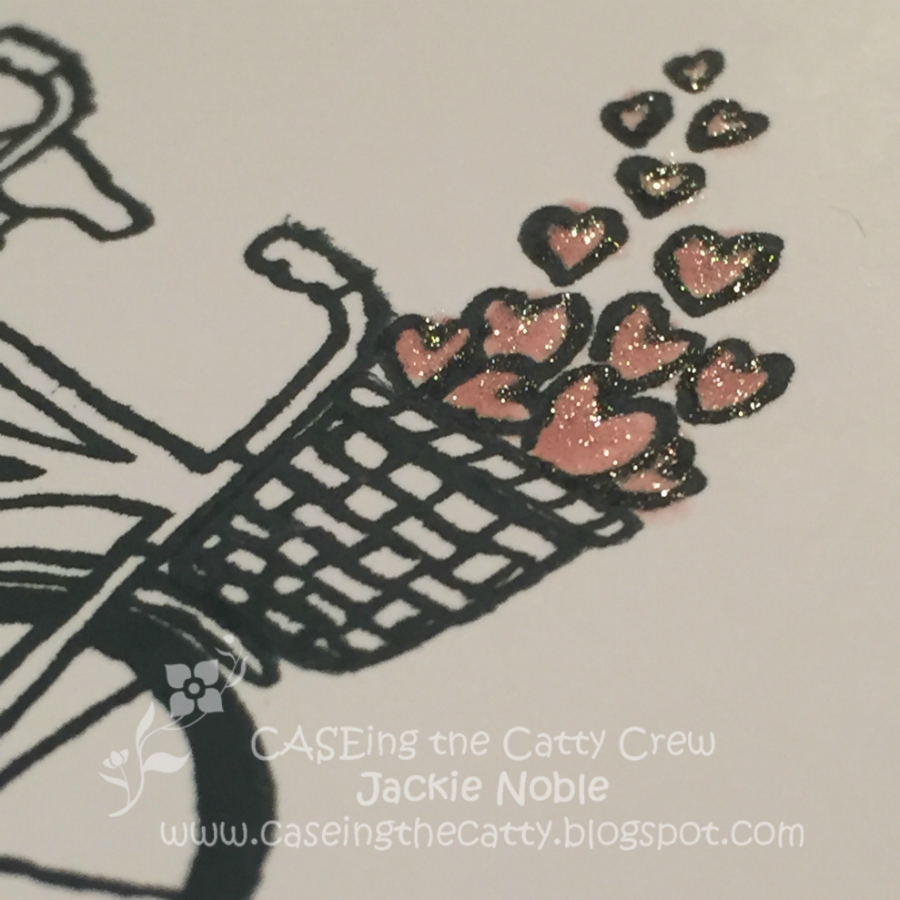 I’ve stamped the bike, basket and hearts from the Pedal Pushers SAB stamp set and added a little Clear Wink of Stella onto the hearts after I’d coloured them with me Blushing Bride Stampin’ Write Marker – from the Subtles set of Markers.