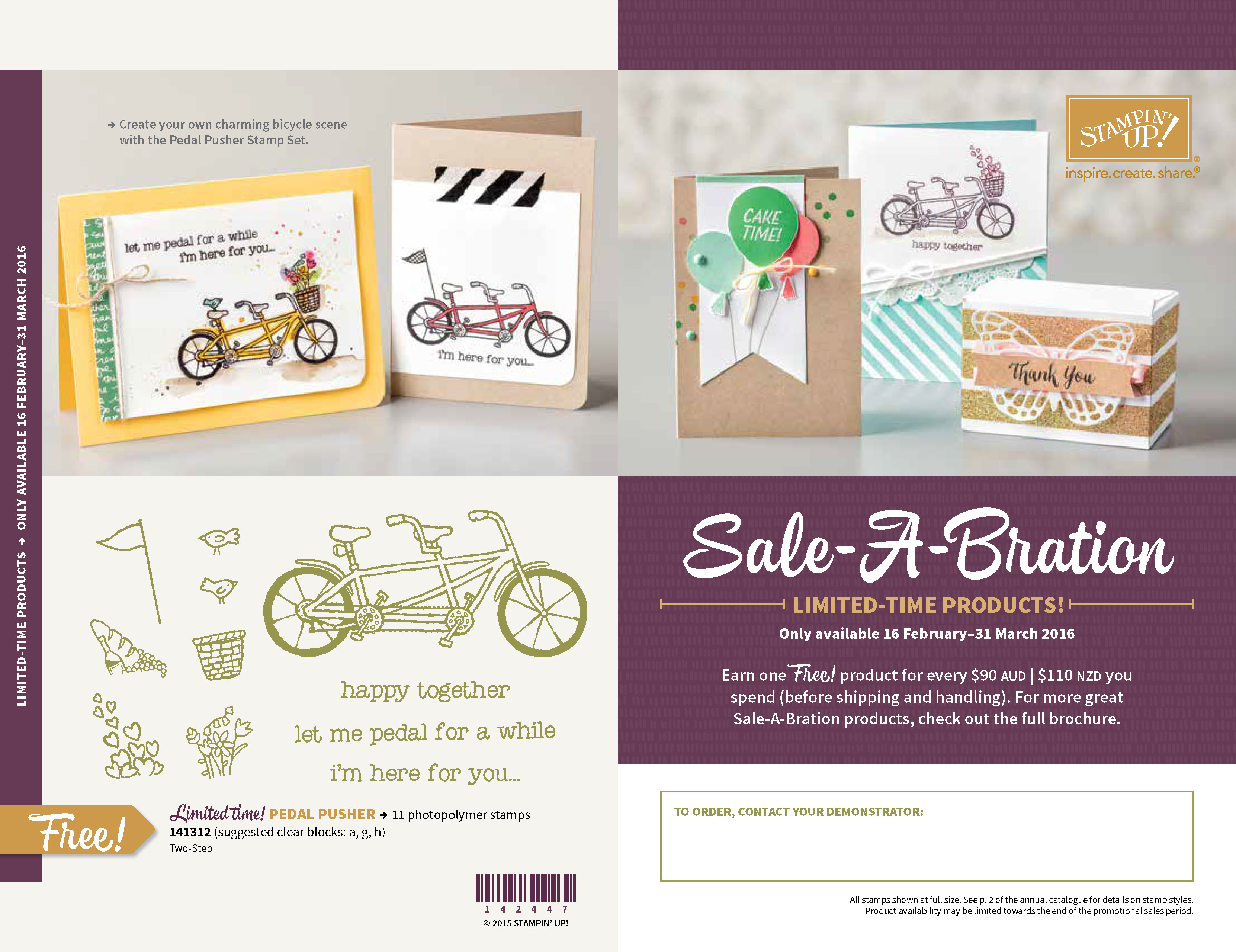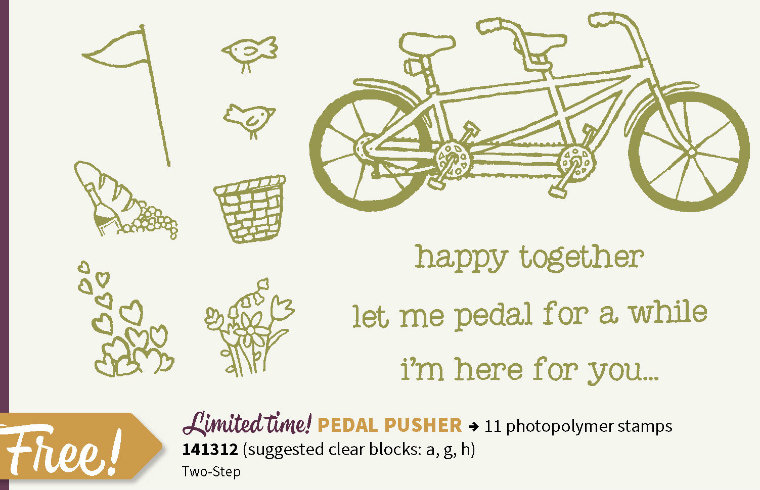 I’m using one of these new items in my project – the Pedal Pusher Stamp Set. The image below shows the back and front of the flyer introducing the three new items. Isn’t that tandem bike just too cute!?