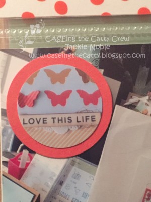 The bottom left 3×4″ pocket on page one has a cute little “Love” stamped, punched out and added as an embellishment. Instead – I took a photo of one of the pages of the Enjoy the Little Things Clipboard Project Kit – printed, punched out and matted it. A perfect sentiment for how I feel about being a Stampin’ Up! demo!
