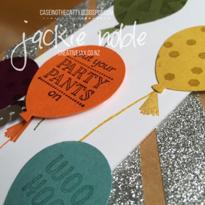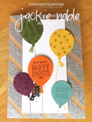Each balloon has some stamping on it – either one of the sentiments from the Party Pants stamp set or one of the other images. Love how the stamp of the balloon tassel makes a cute pattern on the balloons too! I did all the stamping with the Classic Ink pads in the 2014-2016 In Colors