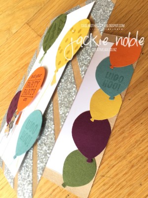 I made my stripped background by sticking the Silver Metallics Glitter Tape onto a card-base made from Kraft cardstock. The balloons are punch out of the five 2014-2016 In Colors using the Balloon Bouquet Punch and I used the 2014-2016 In Colors Stampin’ Write markers to draw the strings. There is a stamp for the string included in the set, but for this card I wanted the strings to fall differently than the stamp so simply drew the strings.
