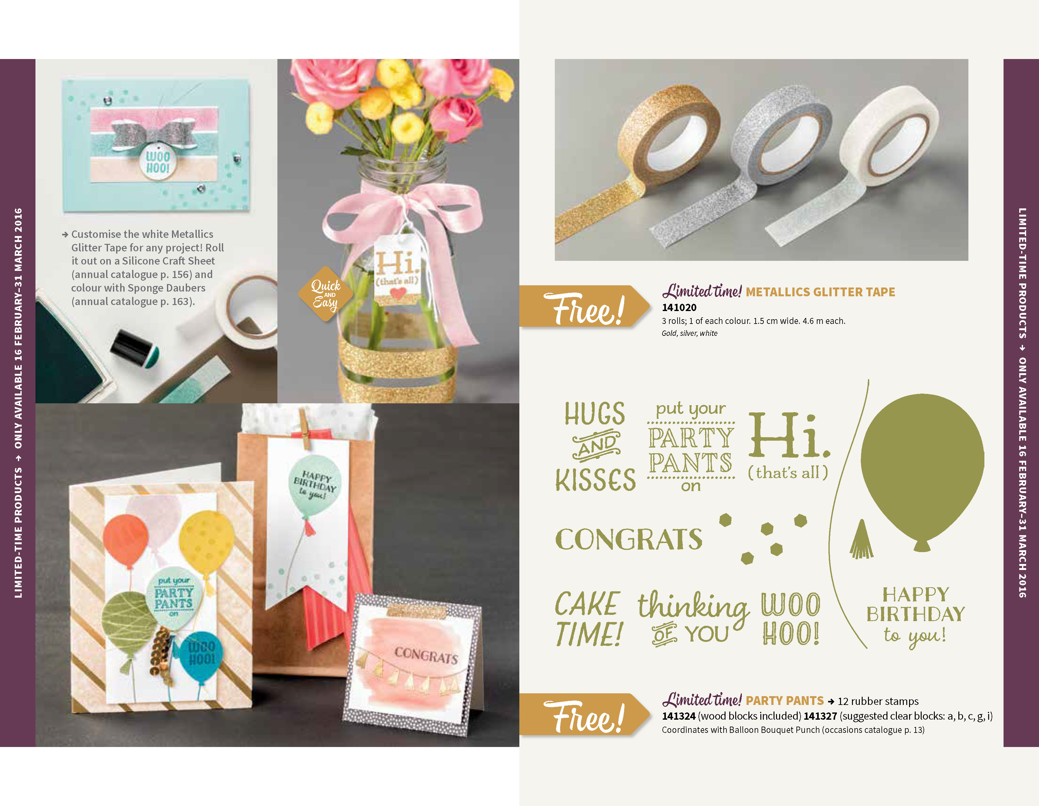 For this Hop I’m featuring the other two new SAB products – the Metallics Glitter Tape and the Party Pants stamp set which you can see on the right-hand side of the page below.