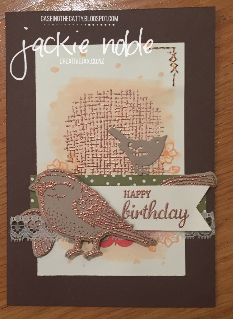 As you can see I’ve kept the layout and elements pretty much like the original – though I did use the mat dimensions more like the second card. The colours are Chocolate Chip, Very Vanilla, Crumb Cake, Peekaboo Peach, Old Olive, Watermelon Wonder and Copper.