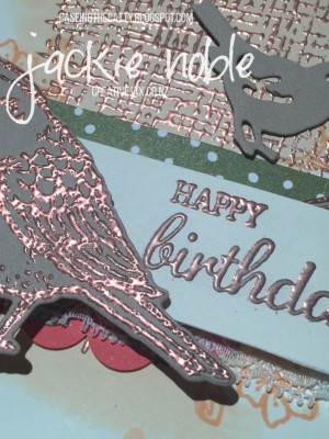 I stamped and copper embossed one of the two birds in the Best Birds set and the branch image onto Crumb Cake cardstock. Then cut these and the small bird using thinlits from the Birds & Blooms set.