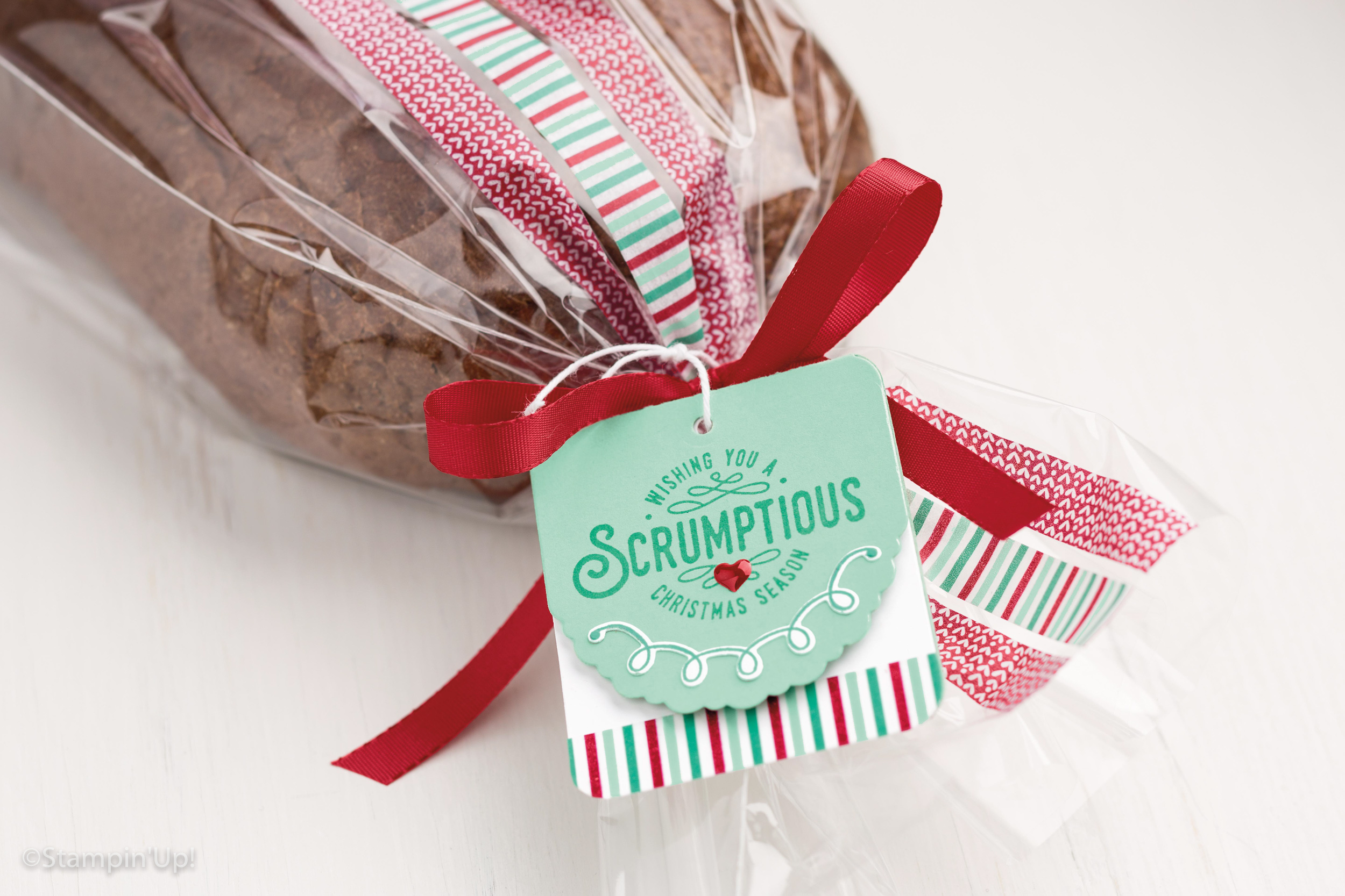 In my CASE, I’ve kept the tag pretty much the same as the original – just changing some of the colours used. In keeping with the Hello December colour palette, I’ve used Whisper White and Kraft Cardstock, Emerald Envy Ink, White Baker’s Twine and several Real Red items – washi tape, Satin Ribbon, Enamel Embellishments and the Stitched Edge Ribbon – Yay for coordinating products!