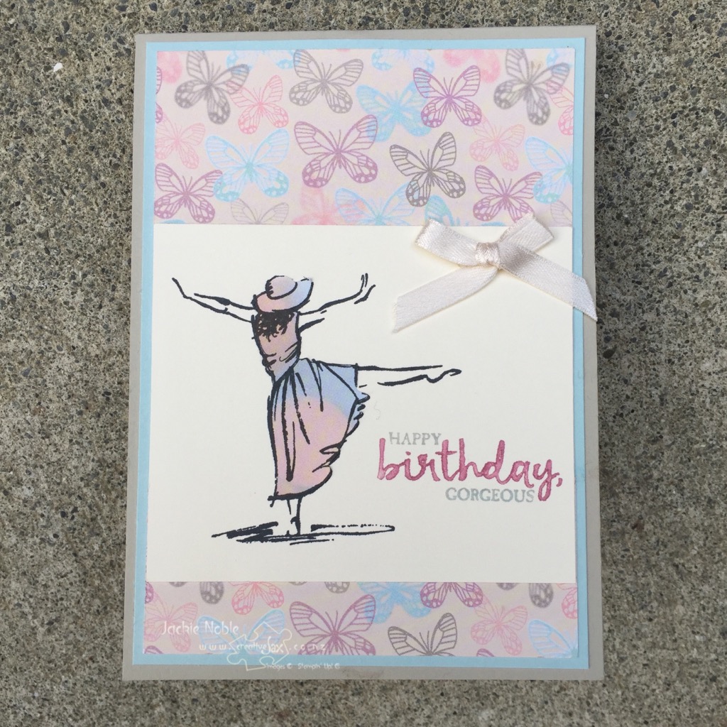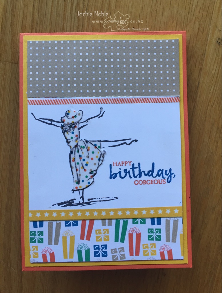 I love this stamp set and wanted to feature it in today’s post, and I was also keen to share some of the fabulous new Designer Series Papers (DSPs) in the new catty. So I’ve redone the card using two of these – Party Animal and Falling in Love. Each of the girls in these cards are stamped onto DSP the cutout. The images are also stamped onto cardstock and then the cutout image on the DSP is stuck onto this. I love the effect this technique achieves.