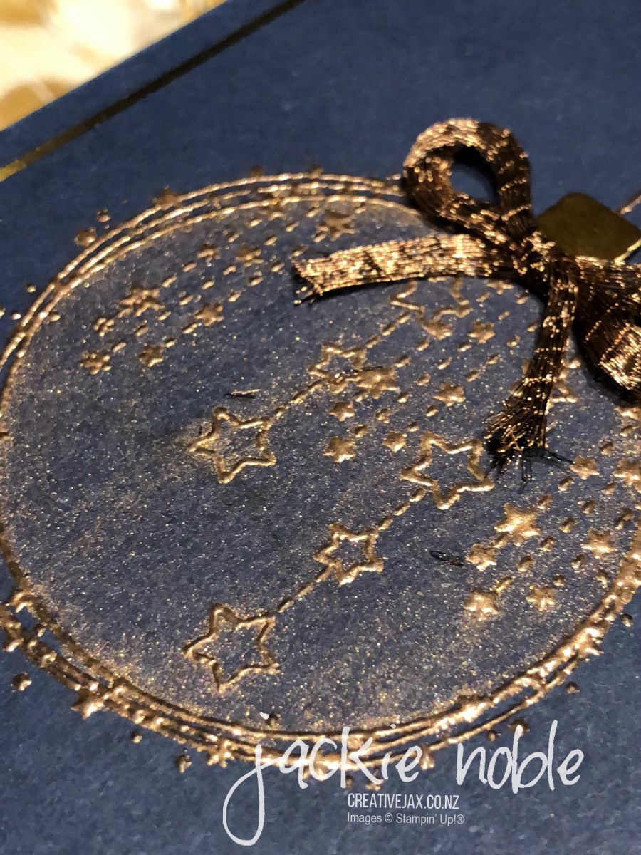 Using versamark and more copper embossing, I added some decorations and a string to the bauble with some of the other stamps in the set, along with a sentiment.