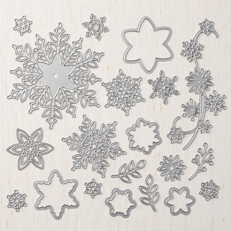 There are two stamp sets, embellishments, velvet paper and thinlits available as part of the Snowflake Showcase.