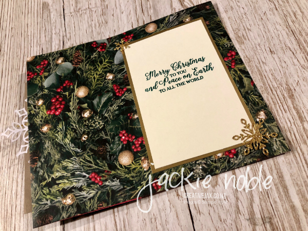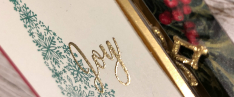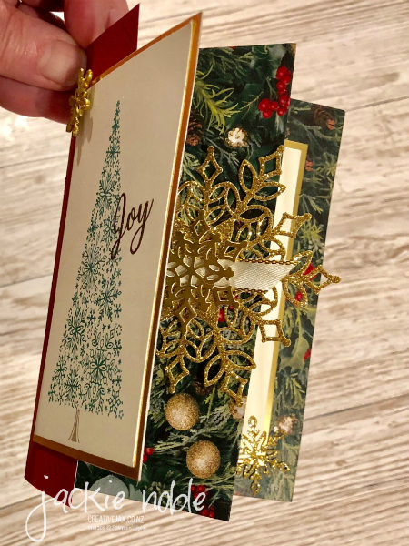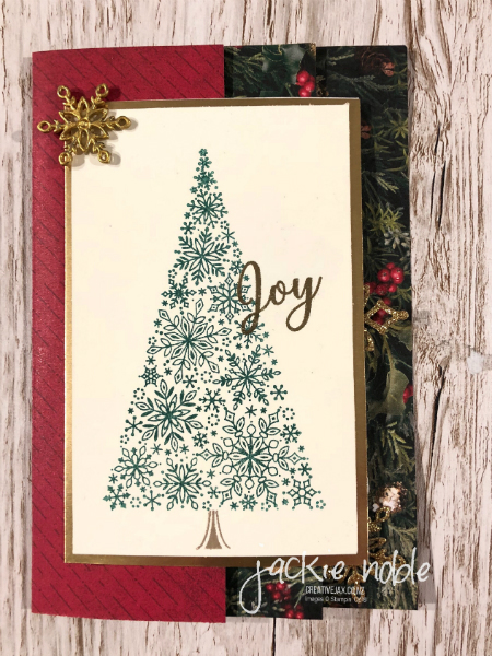 The Tree is stamped in Shaded Spruce while “Joy” has been heat embossed in Gold. I love the way the gold snowflakes on the inside pages peek out and can be seen when the card is closed.