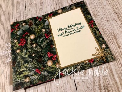 The paper’s colours are Call Me Clover, Cherry Cobbler, Crumb Cake, gold, Real Red, Shaded Spruce and Whisper White and the artwork is a mixture of photo type images, graphics and backgrounds. There are lots of coordinating products as the paper is part of the All is Bright Suite which you can view HERE.