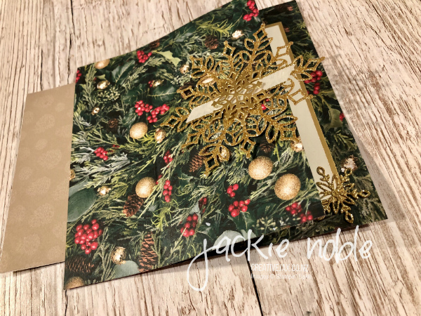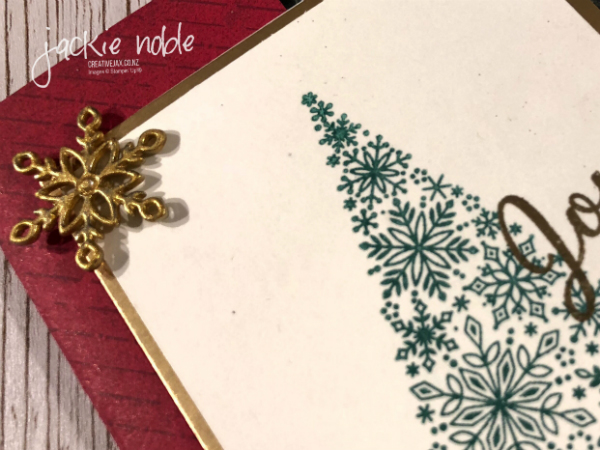 I’ve decorated the with two snowflakes cut with the Snowfall Thinlits. There are 20 dies in this set – including 15 snowflakes! The large snowflake is cut from the Gold Glimmer Paper, the smaller snowflake from the Gold Foil Sheet and there is a piece of Gold 3/8″ Metallic-Edge Ribbon between the snowflakes.