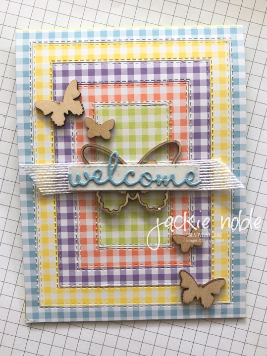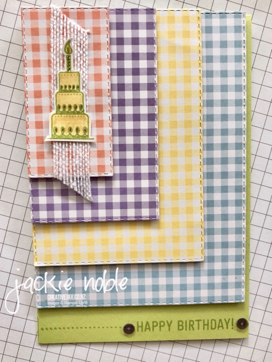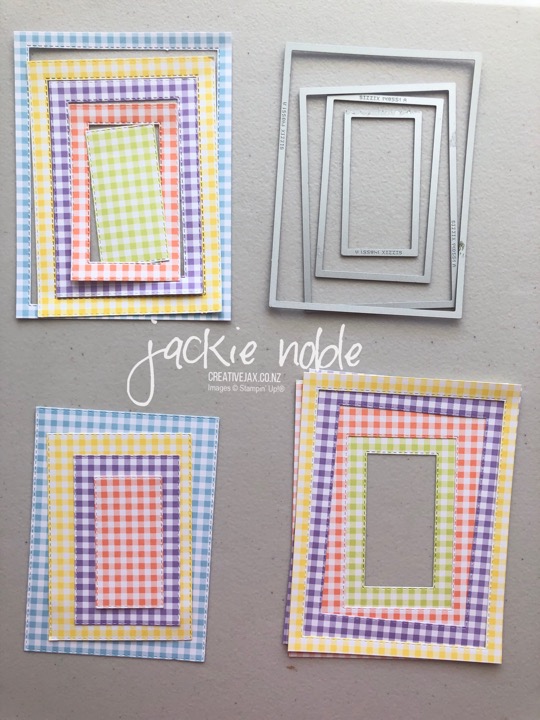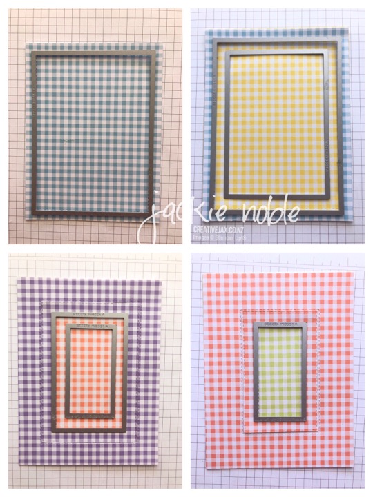 I’ve used the side of the DSP that has the smaller check, and inlaid one layer of each of the five colours which have been cut using the Rectangle Stitched Framelits.