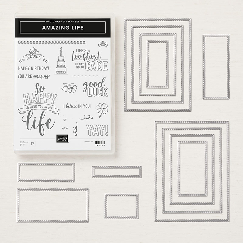 The sentiments and images are from the Amazing Life stamp set which co-ordinates with the Rectangle Stitched Framelits. These are available individually or as a bundle – always a great option as that has a 10% discount on both items! You can click on the image to view more details of the Amazing Life Bundle in my Online Store.
