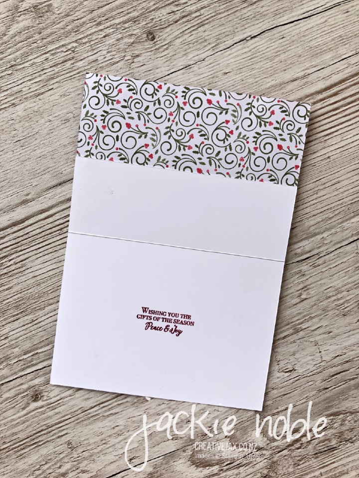 So often both sides of a piece of DSP are gorgeous and it seems wrong to hide one side by sticking it down on a full card front. Attendees at my Christmas Cards Class this week have enjoyed making this card and loved being able to see both sides of this stunning DSP. It is a layout that you can use in a huge variety of cards – not just Christmas.