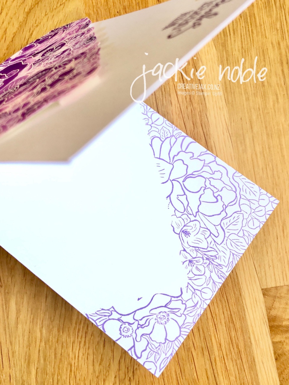 I carried the pattern through to the inside of the card by masking part and stamping the Breathtaking Bouquet image in Highland Heather. I found the Stamparatus helpful in this step.