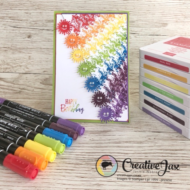 Ink: Classic Ink Pads and Stampin’ Write Markers in the following colours. Real Red, Pumpkin Pie, Daffodil Delight, Granny Apple Green, Pacific Point, Blackberry Bliss and Gorgeous Grape