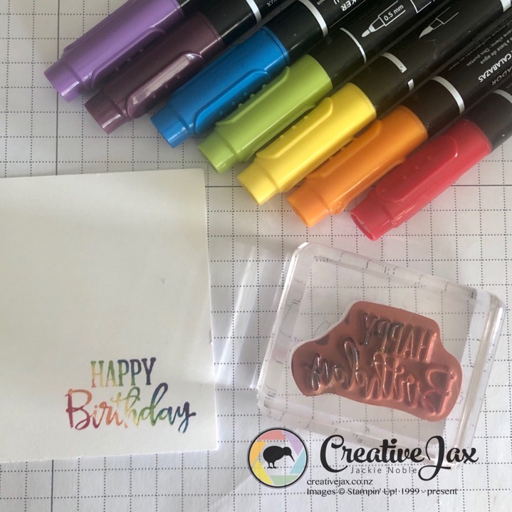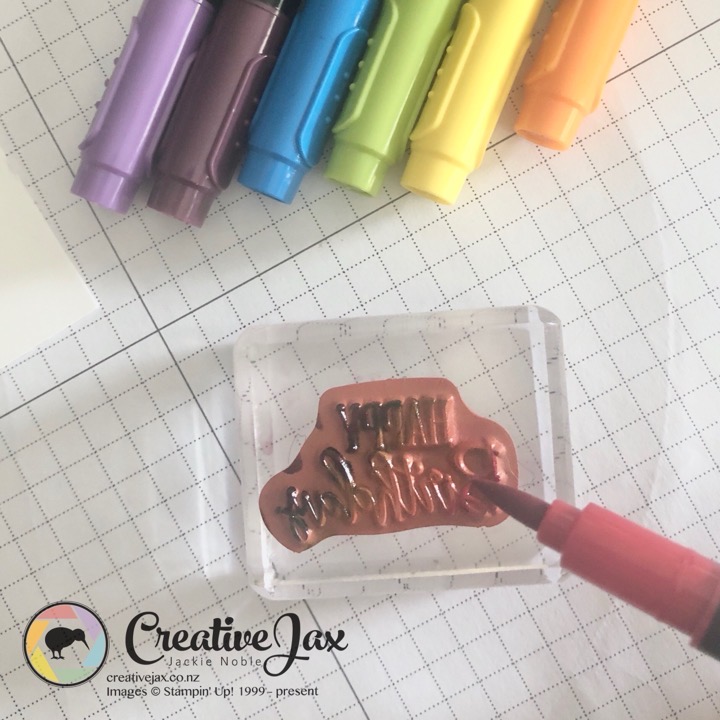 To get the rainbow in my sentiment, I used the Stampomn’ Write Marker. By running the brush tip end of the pen and gently colouring straight onto the stamp, you can achieve the multicoloured look.